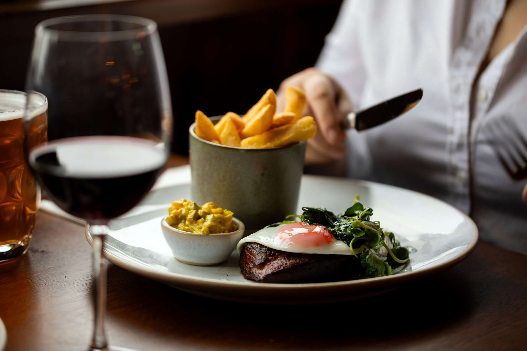 At the bar, enjoy a handpicked selection of wines, real ales, and craft beers, perfect for pairing with gloomy days and dark, cosy evenings. Discover the true taste of a Great British pub.